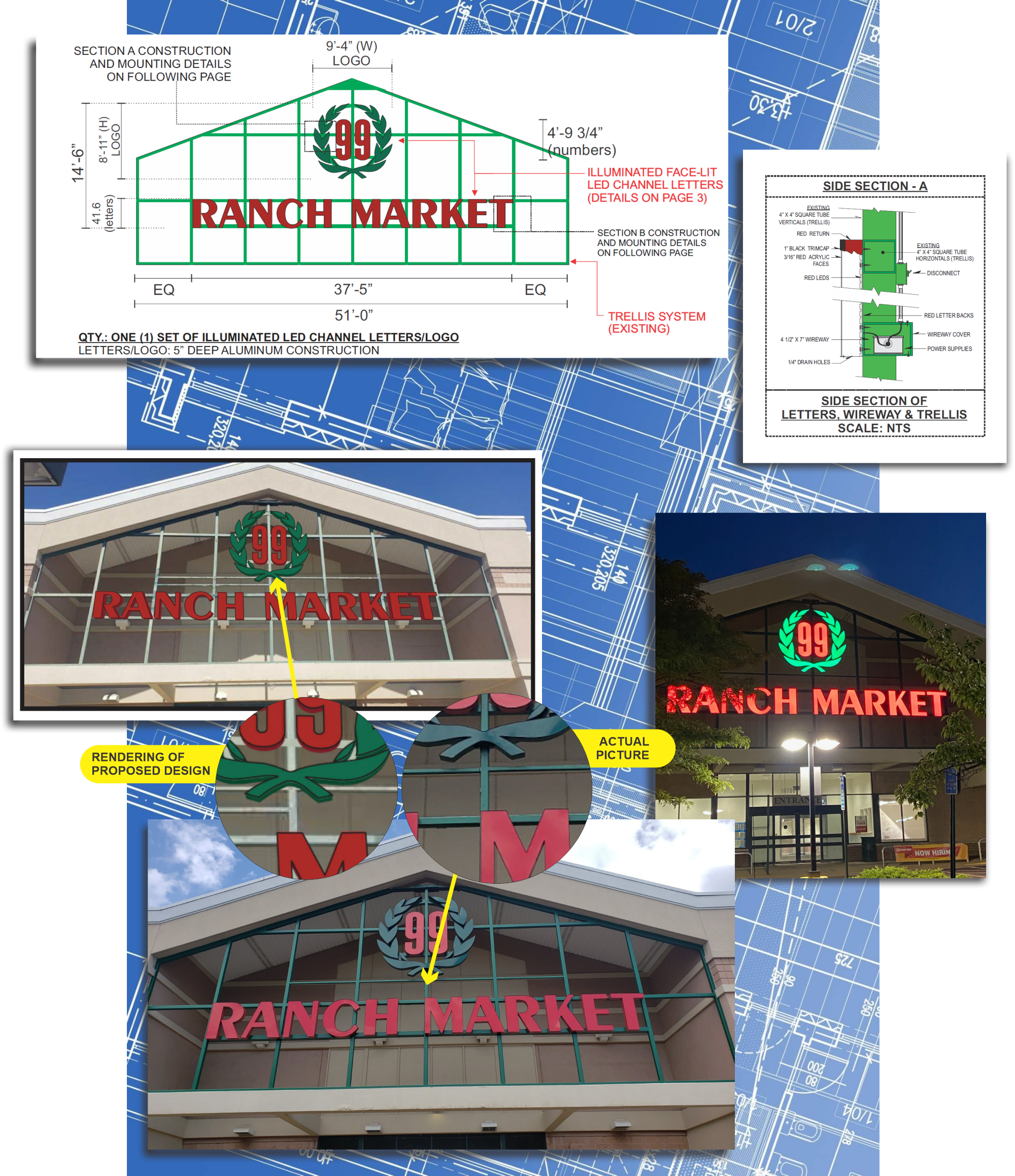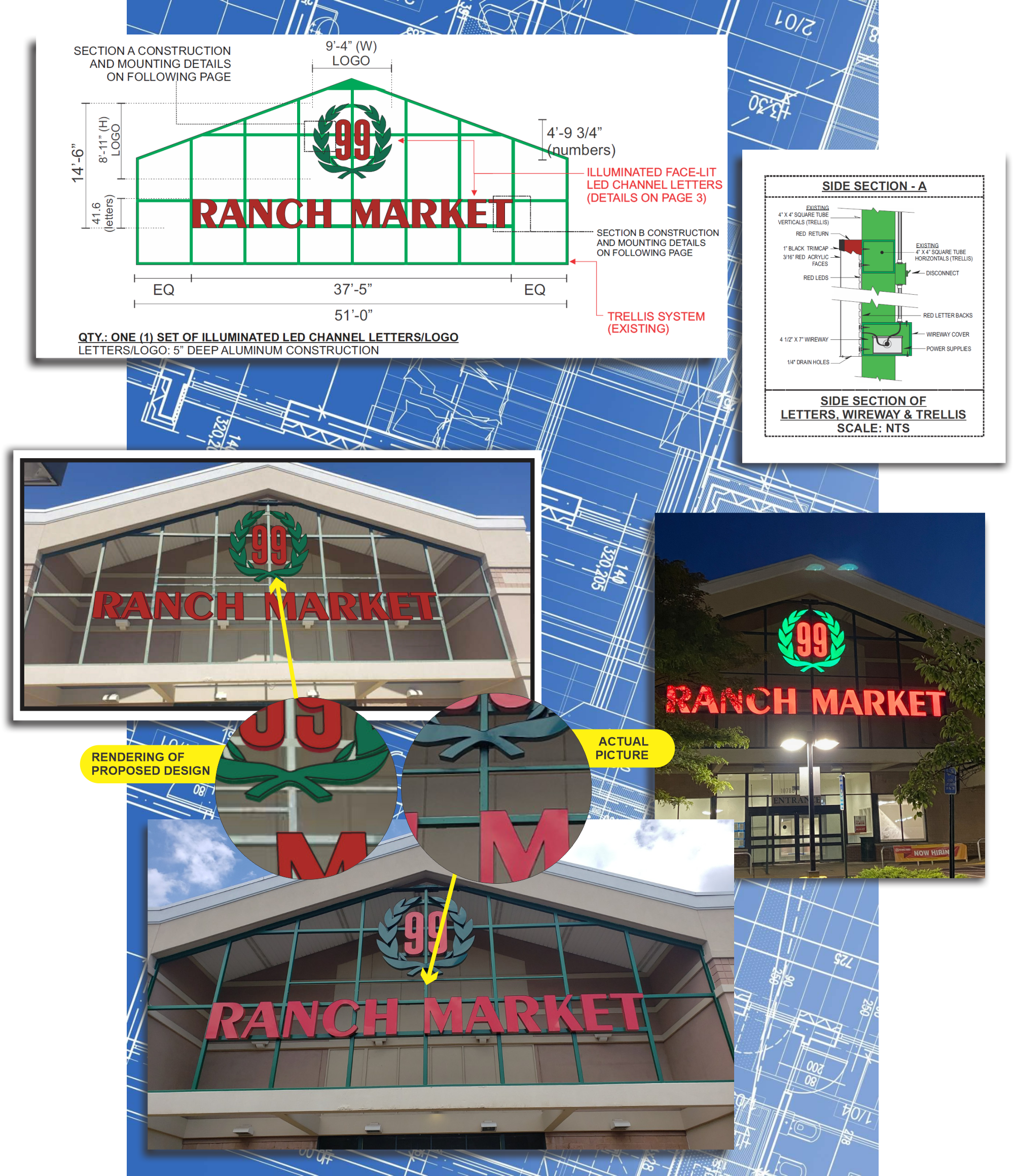 DMS signs design process for 99 Ranch Market. Proposed layout rendering and final product