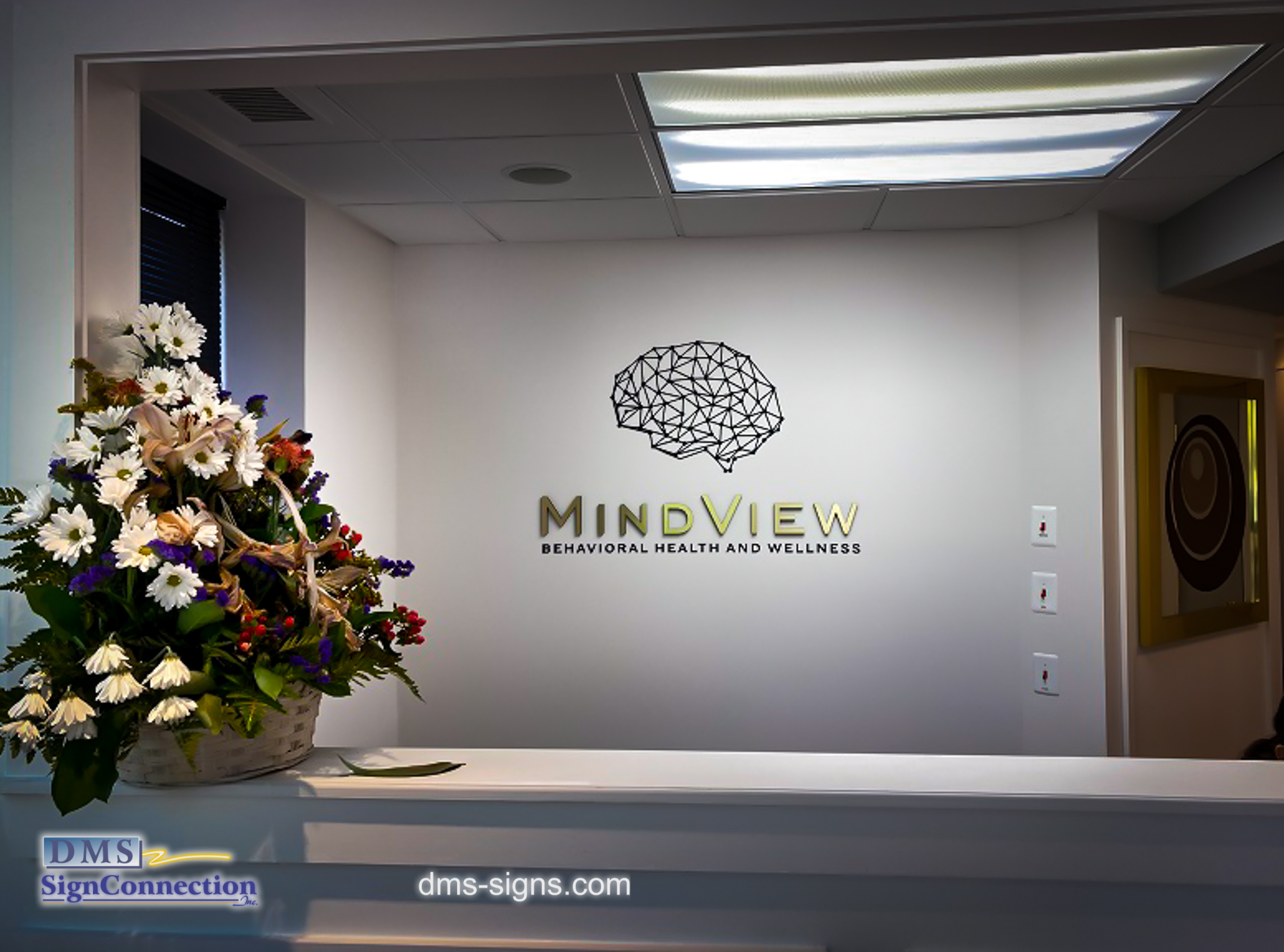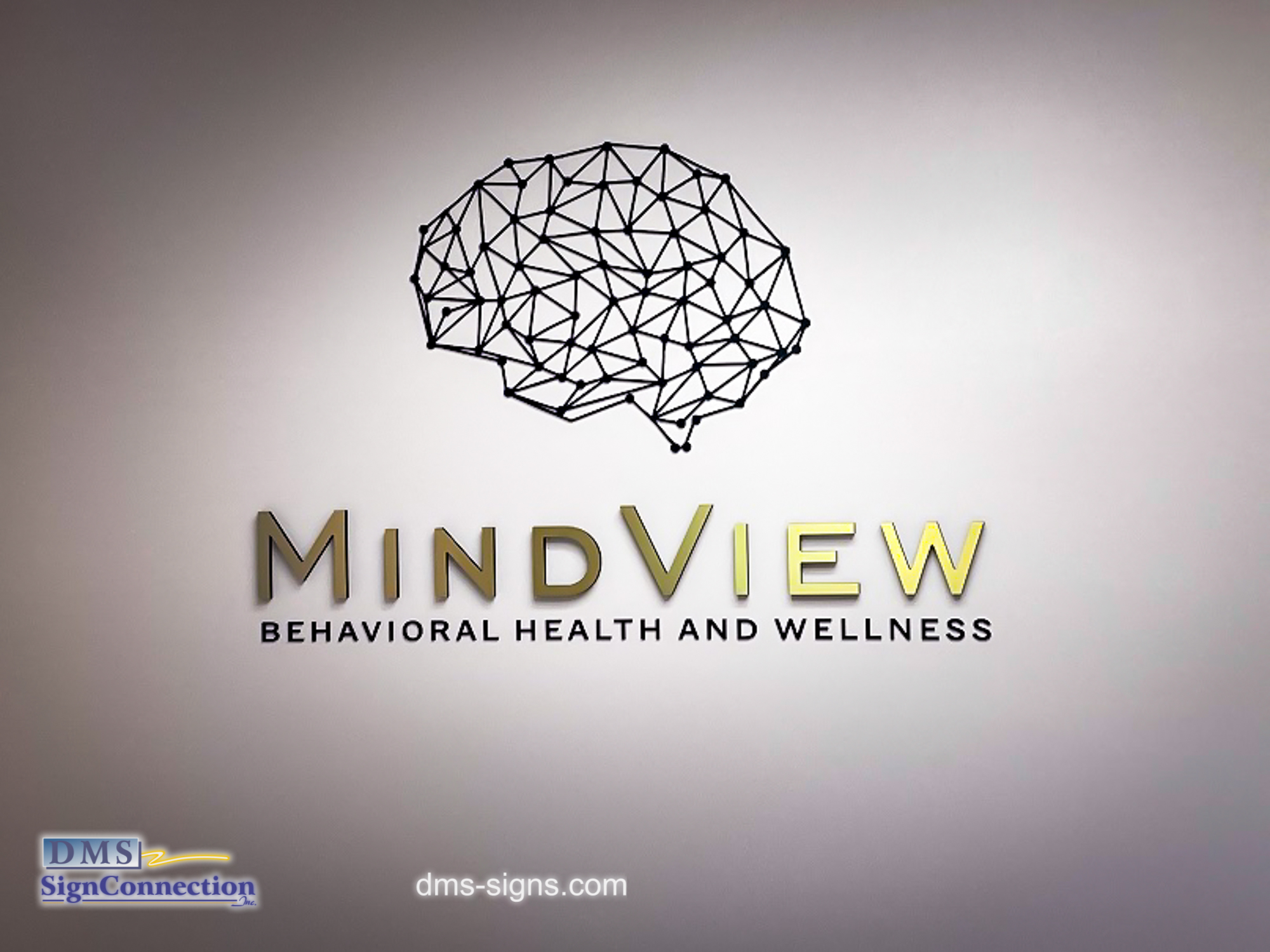 Mindview has a very appropriate and eye catchy logo shape of a brain made out of connecting dots. DMS made a cut acrylic shape and it looks great against the off-white wall in their lobby area.