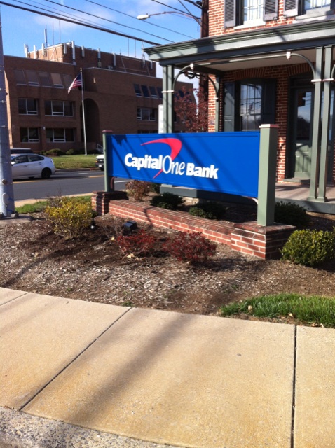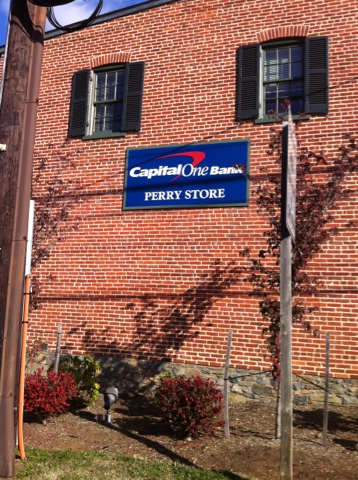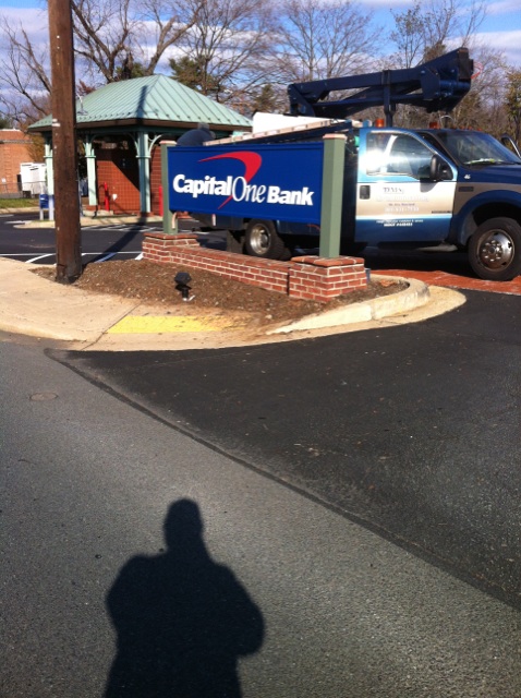 Capital One Bank – Potomac, MD – design, manufacture, and install (2) custom monument signs.  Remove paint and restore brick exterior of this historic Perry Store building and install a custom building sign.  (Some before photos of the wall before the restoration)
