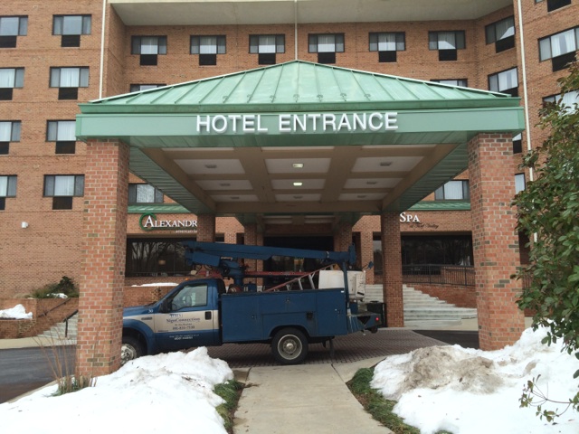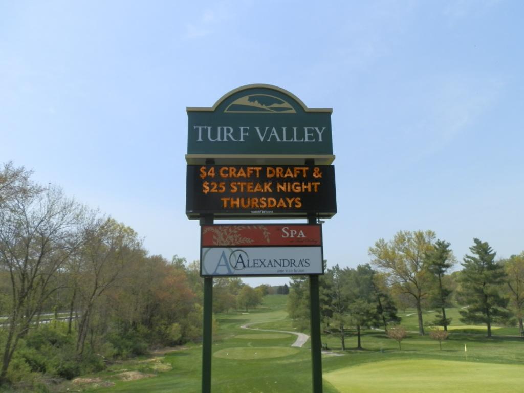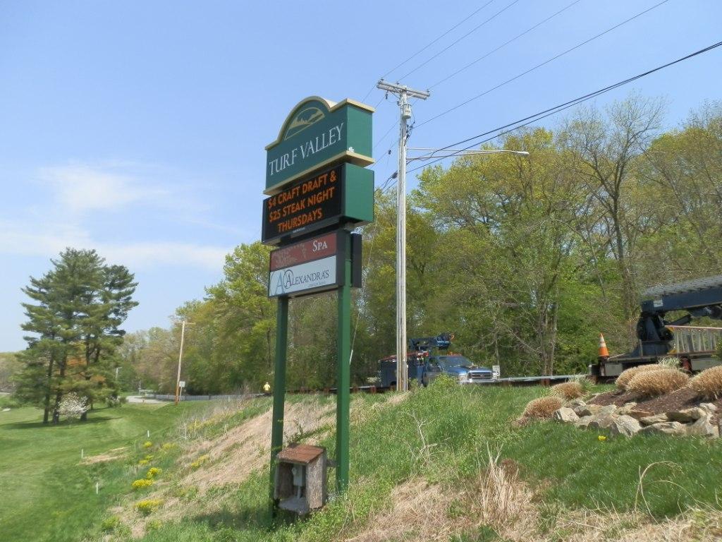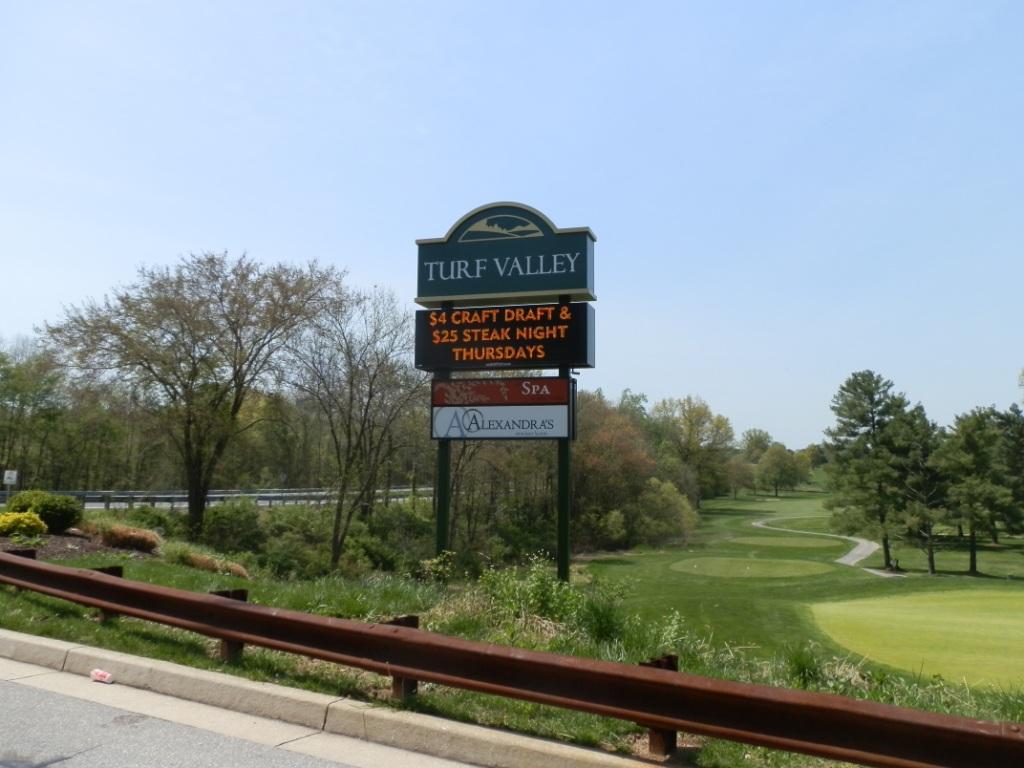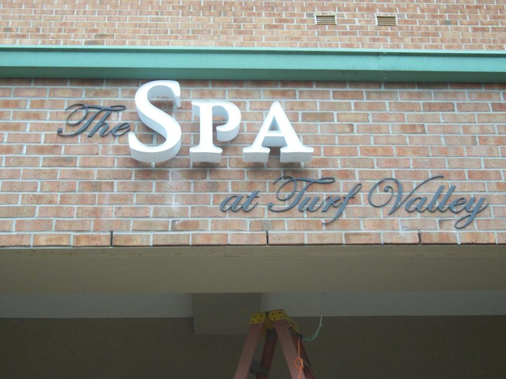 Turf Valley Resort, Ellicott City, MD – Design, Fabrication and Installation of “HOTEL ENTRANCE” channel letters with custom backer panels to match existing canopy, Alexandra’s Restaurant Building Sign, The Spa at Turf Valley Building Sign, and a sign cabinet for the pylon sign on Rte 40.